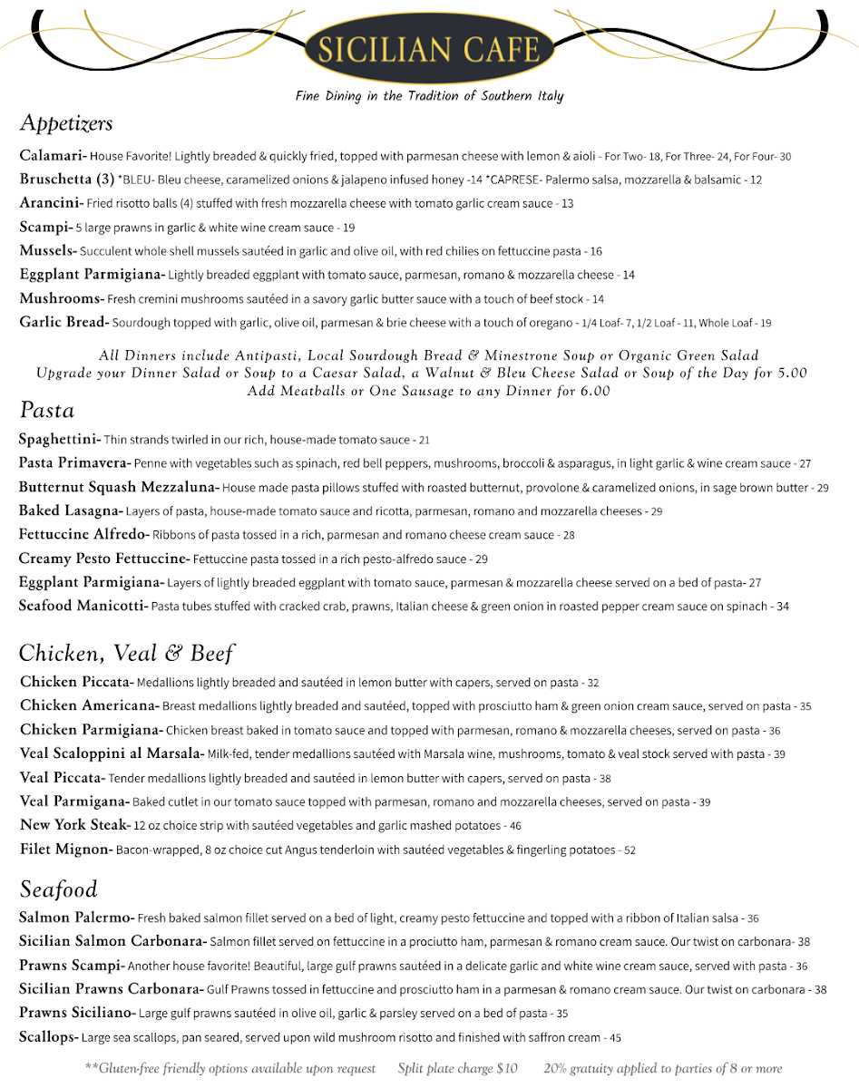 Looking for a spot that offers a cozy atmosphere and mouthwatering flavors? The Sicilian Cafe Menu at 240 Wall St in Chico, CA has you covered. From classic pasta dishes to fresh salads, every bite feels like a trip to Sicily. The menu brings together a variety of traditional Italian meals with a local twist, making it easy to find something to satisfy any craving. Whether you’re in the mood for a savory pizza, a hearty lasagna, or something lighter, there's no shortage of options. The ingredients are always fresh, and the flavors are rich, giving you a taste of authentic Sicilian cuisine with every dish. Whether you're a long-time fan of Italian food or a first-timer, you'll leave feeling like you've found a new favorite.